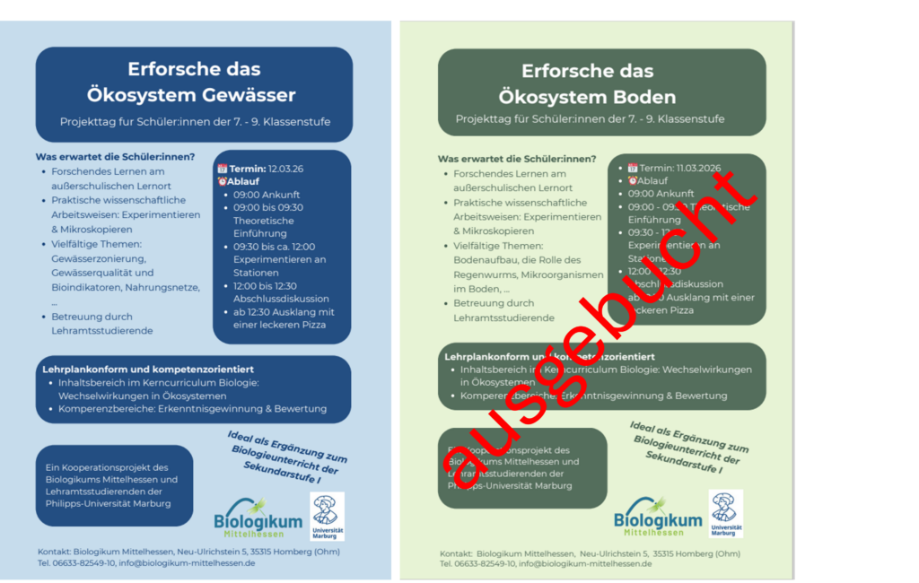 Es besteht wieder die Möglichkeit eine wissenschaftlichen Hausarbeit (WHA) im Lehramt in Kooperation mit dem Biologikum Mittelhessen anzufertigen.